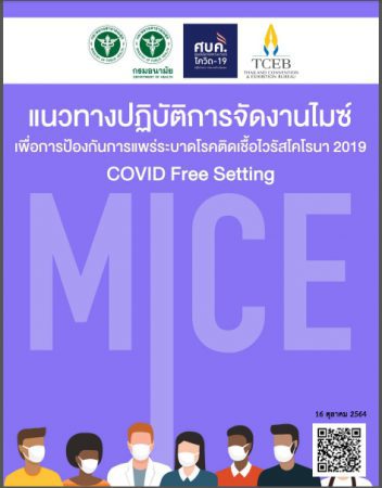 “การเสนอมาตรการผ่อนปรนตามช่วงระยะดังกล่าว เพื่อให้สามารถรองรับการจัดงานไมซ์ที่กำลังจะเกิดขึ้นในช่วงปลายปีนี้ โดยในช่วงตุลาคม-ธันวาคม 2564 จะมีงานไมซ์จัดกว่า 1,000 กลุ่ม เช่น งานแสดงสินค้ามีจำนวน 54 งาน ซึ่งจัดในพื้นที่กรุงเทพฯ และนนทบุรีจำนวน 32 งาน ในพื้นที่ต่างจังหวัดทั่วประเทศจำนวน 22 งาน โดยการจัดงานไมซ์ดังกล่าวนี้จะช่วยให้ผู้จัดงาน โรงแรม สถานที่จัดงาน การขนส่ง ร้านอาหาร ธุรกิจผู้ประกอบการต่างๆ ทั้งในส่วนกลางกรุงเทพฯ และระดับท้องถิ่นชุมชน เกิดการจ้างงานสร้างรายได้กระจายในภูมิภาคทั่วประเทศ และขอความร่วมมือผู้ประกอบการไมซ์ดำเนินการจัดงานตาม ‘แนวทางปฏิบัติการจัดงานไมซ์’ ภายใต้มาตรการปลอดภัยสำหรับองค์กร หรือ COVID Free Setting ที่กระทรวงสาธารณสุขร่วมกับทีเส็บได้กำหนดขึ้นอย่างเคร่งครัด สามารถดาวน์โหลดข้อมูลได้ที่ https://hia.anamai.moph.go.th/th/handbook/2927#wow-book/”