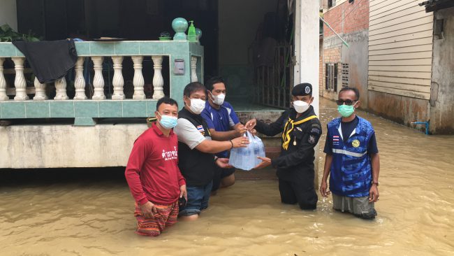 นอกจากนี้แล้ว พ.อ.ก่อเกียรติ รองผู้บังคับการหน่วยเฉพ่ะกิจนราธิวาส และคณะ ยังได้นำข้าวสาร อาหารแห้งและน้ำดื่ม เดินลุยน้ำและนั่งเรือท้องแบน ไปแจกจ่ายให้กับชาวบ้านในครั้งนี้ด้วย ซึ่งหมู่บ้านบ่อทอง มีน้ำท่วมขังโดยภาพรวมเฉลี่ยสูง 40 ถึง 130 ซ.ม. ประชาชนอาศัยอยู่ในหมู่บ้านดังกล่าวต่างนำยานพาหนะออกมาจอดบริเวณที่เนินสูงนอกหมู่บ้าน และหากมีกิจธุระจำเป็น ต้องใช้เรือเป็นยานพาหนะในการเดินทางสู่โลกภายนอก และจากสภาวะฝนตกลงมาอย่างต่อเนื่องในครั้งนี้ มีแนวโน้มน้ำท่วมขังบ้านเรือนและพื้นที่ทางเกษตรของประชาชน ที่อาศัยอยู่ในพื้นที่ อ.ระแงะ ขยายเป็นวงกว้าง
