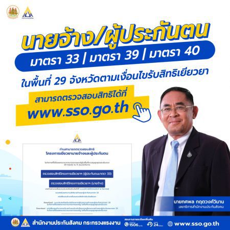 นายจ้าง/ผู้ประกันตน ม.33 ม.39 ม.40 ในพื้นที่ 29 จังหวัดตามเงื่อนไข ตรวจสอบสิทธิเยียวยาได้ที่เว็บไซต์ www.sso.go.th