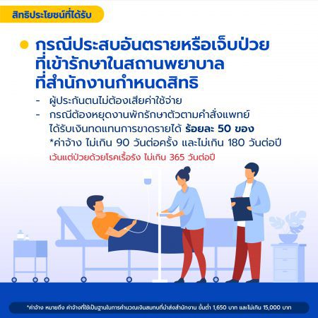 – กรณีต้องหยุดงานพักรักษาตัวตามคาสั่งแพทย์ ได้รับเงินทดแทนการขาดรายได้ ร้อยละ 50 ของ*ค่าจ้าง ไม่เกิน 90 วันต่อครั้ง และไม่เกิน 180 วันต่อปี เว้นแต่ป่วยด้วยโรคเรื้อรัง ไม่เกิน 365 วันต่อปี