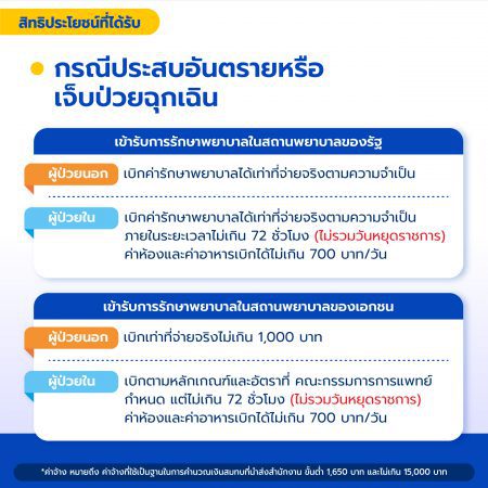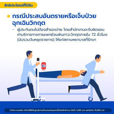 ผู้ประกันตนไม่ต้องสารองจ่าย โดยสำนักงานจะรับผิดชอบค่าบริการทางการแพทย์จนพ้นภาวะวิกฤตภายใน 72 ชั่วโมง (นับรวมวันหยุดราชการ) ให้แก่สถานพยาบาลที่รักษา