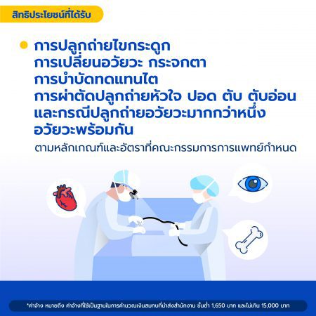  การปลูกถ่ายไขกระดูก การเปลี่ยนอวัยวะกระจกตา การบำบัดทดแทนไต การผ่าตัดปลูกถ่ายหัวใจ ปอด ตับ ตับอ่อน และกรณีปลูกถ่ายอวัยวะมากกว่าหนึ่งอวัยวะพร้อมกัน