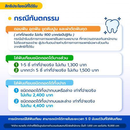 การเบิกกรณีใส่ฟันเทียม สามารถเบิกได้ภายในระยะเวลา 5 ปี นับแต่วันที่ใส่ฟันเทียม