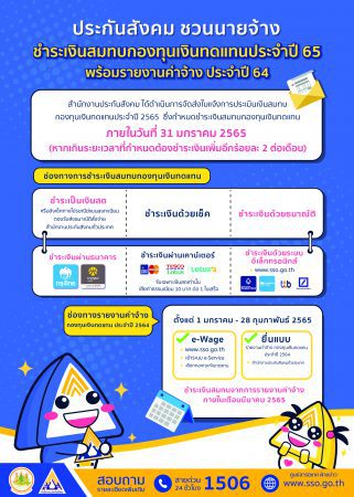 นายบุญสงค์ ทัพชัยยุทธ์ เลขาธิการสำนักงานประกันสังคม กระทรวงแรงงาน เปิดเผยว่า สำนักงานประกันสังคมได้ดำเนินการจัดส่งใบแจ้งการประเมินเงินสมทบ กองทุนเงินทดแทนประจำปี 2565 เพื่อให้นายจ้างนำไปชำระเงินสมทบประจำปี 2565 ซึ่งกำหนดชำระเงินสมทบกองทุนเงินทดแทนภายในวันที่ 31 มกราคม 2565 หากพ้นระยะเวลา ที่กำหนด ต้องชำระเงินเพิ่มอีกร้อยละ 2 ต่อเดือนของจำนวนเงินสมทบที่ต้องจ่าย โดยวิธีการชำระเงินสมทบกองทุนเงินทดแทน สามารถชำระได้หลายวิธี ดังนี้