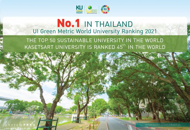 จากการประกาศผลการจัดอันดับมหาวิทยาลัยสีเขียวโลก ปี 2564 (UI Green Metric World University Ranking 2021) เมื่อวันที่ 14 ธันวาคม 2564 ที่ผ่านมา ผลปรากฏว่า มหาวิทยาลัยเกษตรศาสตร์ ได้รับการจัดอันดับให้เป็นสถาบันการศึกษาสีเขียวที่เป็นมิตรกับสิ่งแวดล้อมที่สุดในโลก ติดทอป 50 มหาวิทยาลัยสีเขียวโลกในรอบ 4 ปีที่ผ่านมา คือ  ปี 2017 อันดับที่ 96 ของโลก อันดับที่ 3 ของไทย ปี 2018 อันดับที่ 89 ของโลก อันดับที่2 ของไทย ปี 2019 อันดับที่ 81ของโลก อันดับที่ 2 ของไทย ปี 2020 อันดับที่ 73 ของโลก อันดับที่ 2 ของไทย และล่าสุด ปี 2021 อยู่ในอันดับที่ 45 ของโลก ซึ่งอันดับดีขึ้นกว่าเดิม 28 อันดับ พร้อมกับคว้าแชมป์ ขึ้นเป็นมหาวิทยาลัยสีเขียวอันดับ 1 ของประเทศไทย  จากจำนวนมหาวิทยาลัยทั่วโลกที่เข้าร่วมการจัดอันดับรวมจำนวนทั้งสิ้น 956 แห่ง ในจำนวนนี้เป็นมหาวิทยาลัยของไทย 39 แห่ง โดยมหาวิทยาลัยเกษตรศาสตร์ ได้รับคะแนน 8,225 คะแนน ( ปี 2020 ได้ 7,775 คะแนน )  จากเกณฑ์การประเมิน 6 ด้าน คือ 1.สถานที่ตั้งและระบบสาธารณูปโภค (Setting & Infrastructure) ได้ 1,175 คะแนน 2.การจัดการพลังงานและการเปลี่ยนแปลงภูมิอากาศ (Energy & Climate Change) ได้ 1,625 คะแนน  3.การจัดการขยะหรือของเสีย (Waste) ได้ 1,425 คะแนน 4.การใช้น้ำ (Water) ได้ 850 คะแนน  5.การจัดการระบบขนส่ง (Transportation) ได้ 1,525 คะแนน และ 6.การศึกษา/การวิจัย (Education & Research) ได้ 1,625 คะแนน