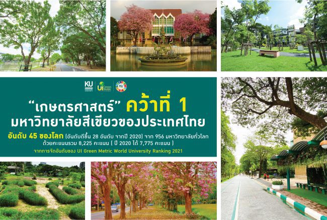 มหาวิทยาลัยเกษตรศาสตร์ ขึ้นแท่นอันดับที่ 45 มหาวิทยาลัยสีเขียวโลก           คว้าแชมป์มหาวิทยาลัยสีเขียว อันดับที่ 1 ของประเทศไทยได้สำเร็จ