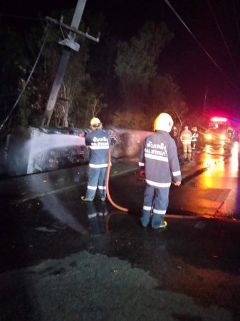 คืนวันสุดท้าย 7 วันอันตราย รถบรรทุกน้ำมัน หลับในวูบลงข้างทาง พลิกคว่ำ ชนเสาไฟฟ้า ไฟลุกท่วม