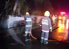 คืนวันสุดท้าย 7 วันอันตราย รถบรรทุกน้ำมัน หลับในวูบลงข้างทาง พลิกคว่ำ ชนเสาไฟฟ้า ไฟลุกท่วม