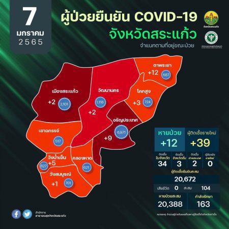 นายแพทย์สาธารณสุขจังหวัดสระแก้ว กล่าวว่า ภาพรวมผู้ป่วยยืนยันที่สูงขึ้นวันนี้จากคลัสเตอร์งานศพบ้านร่มไทร หมู่ 9 และบ้านโคกทหาร หมู่ 5 อ.ตาพระยา ต.ทัพเสด็จ อ.ตาพระยา และติดเชื้อจากญาติพี่น้องที่เดินทางกลับบ้านในช่วงเทศกาลปีใหม่แล้วกลับไปตรวจพบเชื้อ