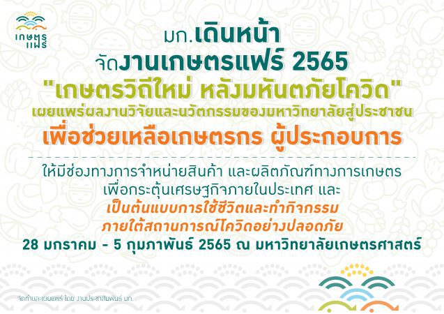 วันที่ 11 มกราคม 2565 ดร.จงรัก วัชรินทร์รัตน์ อธิการบดีมหาวิทยาลัยเกษตรศาสตร์ เปิดเผยว่าเมื่อวันที่10 มกราคม 2565 ได้ประชุมหารือในที่ประชุมรองอธิการบดีมหาวิทยาลัยเกษตรศาสตร์ โดยให้นโยบายการจัดงานเกษตรแฟร์ ปี 2565 ซึ่งมหาวิทยาลัยเกษตรศาสตร์ เตรียมพร้อมเดินหน้าจัดงานเกษตรแฟร์ ประจำปี 2565 “ เกษตรวิถีใหม่ หลังมหันตภัยโควิด ” ระหว่างวันที่ 28 มกราคม – 5 กุมภาพันธ์ 2565 ภายใต้มาตรการเข้มข้นตามแนวทางปฏิบัติด้านสาธารณสุขเพื่อการป้องกันการแพร่ระบาดของเชื้อไวรัสโคโรนา 2019 (COVID-19) ทั้งนี้ เพื่อเป็นต้นแบบในการใช้ชีวิตและทำกิจกรรมภายใต้สถานการณ์โควิดอย่างปลอดภัย อีกทั้งเพื่อช่วยเหลือเกษตรกร ผู้ประกอบการ กลุ่มวิสาหกิจชุมชน มูลนิธิ ฯ ให้มีช่องทางการจำหน่ายสินค้าและผลิตภัณฑ์ทางการเกษตร สินค้าแปรรูป สินค้าอุปโภคบริโภค ฯลฯ และยังเป็นการกระตุ้นเศรษฐกิจภายในประเทศ โดยมหาวิทยาลัยจะพิจารณาเรื่องลดค่าบริการพื้นที่ให้กับเกษตรกร ตามมาตรการให้ความช่วยเหลือในช่วงสถานการณ์โควิด-19