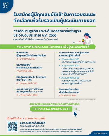 ทั้งนี้ ผู้ที่มีคุณสมบัติและสนใจเข้ารับการอบรมและคัดเลือก สามารถสมัครผ่านทาง https://aqa2.onesqa.or.th/ (สมัครผู้ประเมิน) ตั้งแต่วันนี้ จนถึงวันที่ 31 มกราคม 2565 ดูรายละเอียดเพิ่มเติมทาง www.onesqa.or.th (ประกาศ) หรือดาวน์โหลดประกาศได้ที่ลิงก์ : https://bit.ly/3EZAzGf หรือติดต่อสอบถามโทรศัพท์หมายเลข 02 – 216 – 3955 ต่อ 142,143,145,146,150,153 ในวันและเวลาราชการ