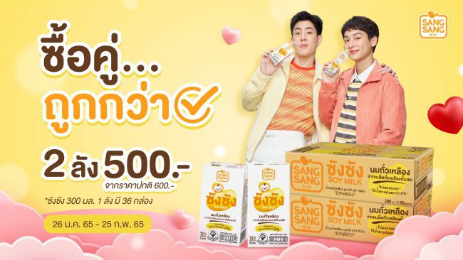 “ซังซัง” นมถั่วเหลืองคั้นสด ผลิตจากเมล็ดถั่วเหลืองจากประเทศแคนาดา หวานน้อย รสชาติอร่อย หอมมัน และมีน้ำตาลน้อยกว่า 2% มอบโปรโมชันพิเศษในช่วงเดือนแห่งความรัก ซื้อคู่ถูกกว่า ให้กับลูกค้าที่ซื้อนมถั่วเหลืองซังซัง 2 ลัง ในราคาสุดปัง เพียง 500 บาทเท่านั้น (จากราคาปกติ 600 บาท) 1 ลัง ประกอบด้วยนมถั่วเหลืองซังซัง 300 มล. บรรจุ 36 กล่อง ผู้สนใจสั่งซื้อได้ทาง https://bit.ly/3u0QCC6 ระยะเวลาโปรโมชันตั้งแต่วันนี้ถึง 25 ก.พ. 65