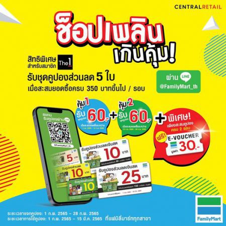 ช็อปเพลิน…เกินคุ้ม!! พิเศษสมาชิก The 1 รับชุดคูปองส่วนลด 5 ใบ เพียงสะสมยอดซื้อครบ 350 บาท ขึ้นไป/รอบ ผ่าน Line @FamilyMart