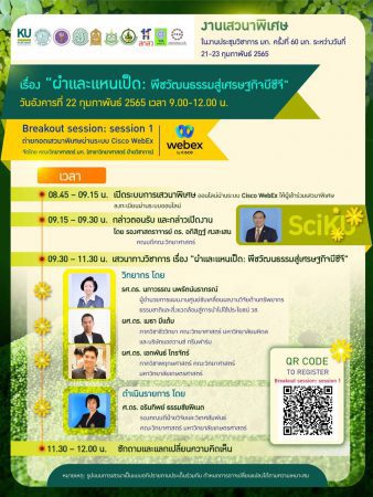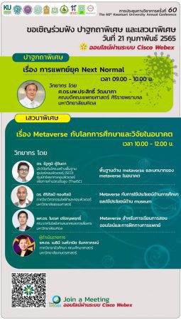 มก.ขอเชิญนิสิตนักศึกษาประชาชนร่วมฟังผลงานวิจัยและการบรรยายพิเศษ การประชุมทางวิชาการครั้งที่ 60 “เกษตรศาสตร์วิถีถัดไป พลิกวิกฤติสู่ความยั่งยืน” 21 – 23 กุมภาพันธ์ 2565 ผ่านระบบ Cisco Webex