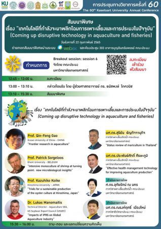 13.00-16.00 น. สัมมนาพิเศษ สาขาประมง เรื่อง “เทคโนโลยีที่กำลังจะมาพลิกโฉมการเพาะเลี้ยงและการประมงในปัจจุบัน”