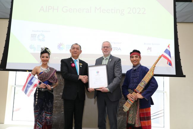 ทั้งนี้ ในพิธีการส่งมอบการเป็นเจ้าภาพจัดงาน ดร.เฉลิมชัย ศรีอ่อน รัฐมนตรีว่าการกระทรวงเกษตรและสหกรณ์ หัวหน้าคณะผู้แทนไทย ได้กล่าวแสดงความขอบคุณในนามของรัฐบาลไทยต่อสมาชิก AIPH สำหรับความไว้วางใจและการสนับสนุนที่มอบให้แก่ประเทศไทย โดยความสำเร็จครั้งนี้ เป็นผลจากความร่วมมือระหว่างหน่วยงานทั้งภาครัฐและเอกชน นำโดยสำนักงานส่งเสริมการจัดประชุมและนิทรรศการ (องค์การมหาชน) หรือ ทีเส็บ และกระทรวงเกษตรและสหกรณ์