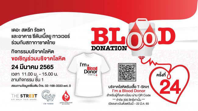เพราะการให้มีความหมายมากกว่าที่คิด ศูนย์การค้า เดอะ สตรีท รัชดา และ อาคารซีดับเบิ้ลยู ทาวเวอร์ ร่วมกับ สภากาชาดไทย ขอเชิญชวนคนไทยร่วมเป็นผู้ให้ด้วยการบริจาคโลหิตในกิจกรรม “Blood Donation ครั้งที่ 24” เพื่อช่วยเหลือผู้ป่วยที่จำเป็นต้องใช้เลือดในการรักษา เป็นการต่อลมหายใจและให้โอกาสเพื่อนมนุษย์อีกหลายชีวิต ซึ่งผู้ที่ลงทะเบียนเข้าร่วมกิจกรรมล่วงหน้า 300 ท่านแรก จะได้รับเสื้อยืด I’m a Blood Donor โดยกิจกรรมจะจัดขึ้นในวันที่ 24 มีนาคม 2565 เวลา 11.00-15.00 น. ณ ลานกิจกรรม ชั้น 1 ศูนย์การค้า เดอะ สตรีท รัชดา