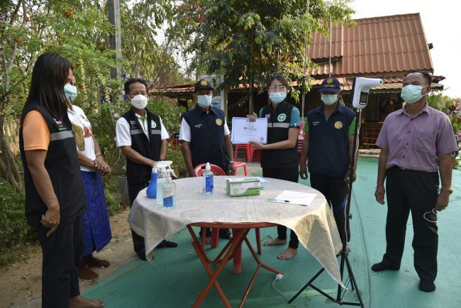 เมื่อวันที่ 12 มีนาคม 2565 ที่วัดป่าพลาญเพชร บ้านโคกแดง หมู่ที่ 2 ต.ไพรพัฒนา อ.ภูสิงห์ จ.ศรีสะเกษ นายสุภาพ แพงมา ผอ.รพ.สต.ไพรพัฒนา พร้อมด้วย นายสำเร็จ ไพรบึง นายก อบต.ไพรพัฒนา นายบุญมี เสนคราม กำนัน ต.ไพรพัฒนา และนายสมหมาย โคกชัย ผู้ใหญ่บ้านโคกแดง หมู่ที่ 2 นำเจ้าหน้าที่สาธารณสุข ผู้ช่วยผู้ใหญ่บ้าน และอสม.ตำบลไพรพัฒนา ได้ลงพื้นที่ประชาสัมพันธ์และให้คำแนะนำแด่พระครูวัชรชยาภินันท์ เจ้าอาวาสวัดป่าพลาญเพชร (ธ) พร้อมคณะศิษยานุศิษย์ ในการปฏิบัติตามมาตรการป้องกันการแพร่ระบาดของโรคติดเชื้อโควิด-19 หลังพบว่าในพื้นที่ ตำบลไพรพัฒนา อ.ภูสิงห์ มีจำนวนผู้ติดเชื้อเพิ่มสูงขึ้น โดยเฉพาะกลุ่มพ่อค้าแม่ค้าและกลุ่มแผงขายลอตเตอรี่ ในพื้นที่หมู่บ้านไพรพัฒนา
