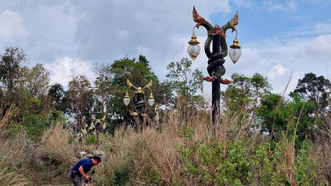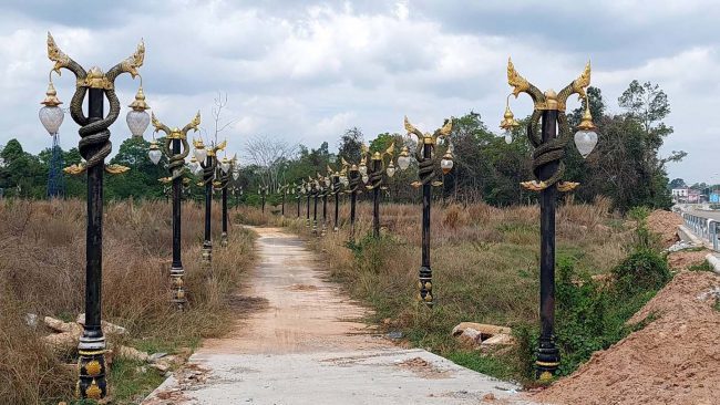 เสาไฟพญานาค ในสวนสาธารณะ จ.มุกดาหาร ถูกทิ้งรกร้างไร้ประโยชน์