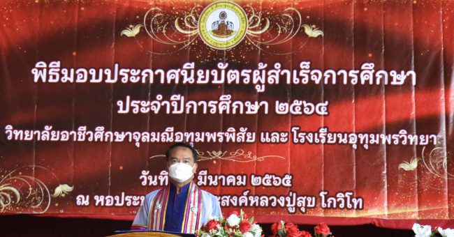 เมื่อวันที่ 29 มีนาคม 2565 ที่ห้องประชุมวิทยาลัยอาชีวศึกษาจุลมณีอุทุมพรพิสัย อำเภออุทุทพิสัย จังหวัดศรีสะเกษ นายวัฒนา พุฒิชาติ ผู้ว่าราชการจังหวัดศรีสะเกษ ได้เป็นประธานมอบประกาศนียบัตรให้แก่ผู้สำเร็จการศึกษาประจำปี 2565 วิทยาลัยอาชีวศึกษาจุลมณีอุทมพรพิสัย โดยมีนายบุญมา นวลสาย ผู้บริหาร/ผู้อำนวยการวิทยาลัยอาชีวศึกษาจุลมณีอุทุมพรพิสัย นายบุญประสงศ์ นวลสายย์ หัวหน้าสนง.ปภ.จังหวัดศรีสะเกษ นายศราวุธ ทรงโฉม นายอำเภออุทุมพรพิสัย นายธนกฤช จิริวิภากร ที่ปรึกษารัฐมนตรีว่าการกระทรวงแรงงาน และเลขานุการนายกองค์การบริหารส่วนจังหวัดศรีสะเกษ ผู้บริหารวิทยาลัยอาชีวศึกษาจุลมณีอุทมพรพิสัย ผู้บิหารสถานศึกษา และคณะอาจารย์ นำนักศึกษาและนักเรียนวิทยาลัยอาชีวศึกษาจุลมณีอุทมพรพิสัย เข้ารับมอบประกาศนียบัตรการศึกษาประจำปี 2565 ซึ่งในปีนี้มีผู้จบการศึกษาตามหลักสูตร ประกอบด้วยระดับวิชาชีพ (ปวช.) ระดับวิชาชีพชั้นสูง (ปวส.) รวมจำนวน 765 คน และระดับมัธยมศึกษา จำนวน 130 คน รวมจำนวนทั้งสิ้น 895 คน ทั้งนี้การมอบประกาศนียบัตรให้แก่ผู้สำเร็จการศึกษาประจำปี 2565 ได้ปฏิบัติตามมาตรการป้องกันการแพร่ระบาดของโรคติดเชื้อไวรัสโควิด-19 ของกระทรวงสาธารณสุขอย่างเคร่งครัด
