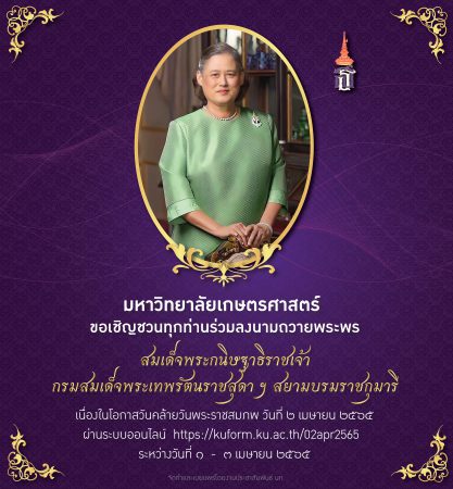 มหาวิทยาลัยเกษตรศาสตร์ ขอเชิญชวนบุคลากร นิสิต นิสิตเก่า และประชาชน ร่วมลงนามถวายพระพร สมเด็จพระกนิษฐาธิราชเจ้า กรมสมเด็จพระเทพรัตนราชสุดา เจ้าฟ้ามหาจักรีสิรินธร มหาวชิราลงกรณวรราชภักดีสิริกิจการิณีพีรยพัฒน รัฐสีมาคุณากรปิยชาติ สยามบรมราชกุมารี เนื่องในโอกาสวันคล้ายวันพระราชสมภพ วันที่ 2 เมษายน 2565 ผ่านระบบออนไลน์ https://kuform.ku.ac.th/02apr2565 ระหว่างวันที่ 1 – 3 เมษายน 2565