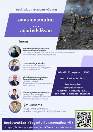 มหาวิทยาลัยเกษตรศาสตร์ จึงเปิดพื้นที่สาธารณะ ขอเชิญผู้สนใจเข้าร่วมการเสวนาทางวิชาการ เรื่อง สงครามกระทบไทย…อยู่อย่างไรให้รอด วันจันทร์ที่ 23 พฤษภาคม 2565 เวลา 13.00 – 16.00 น.ผ่านระบบออนไลน์โปรแกรม Zoom , รับชมและถ่ายทอดทาง Facebook : สถานีวิทยุ ม.ก. เพื่อเป็นการแลกเปลี่ยนข้อคิดเห็นและประสบการณ์ รวมถึงเผยแพร่ความรู้งานวิจัย ผลงานนวัตกรรมที่สามารถช่วยแก้ปัญหา ป้องกัน และเป็นแนวทางที่ถูกต้องสำหรับประเทศไทยจากการได้รับผลกระทบด้านเศรษฐกิจในสงครามครั้งนี้ โดยวิทยากรที่มาร่วมพูดคุยและแสดงความคิดเห็น ได้แก่