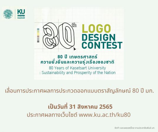 ผศ.รัชด ชมภูนิช ประธานคณะกรรมการจัดโครงการประกวดออกแบบตราสัญลักษณ์เนื่องในงาน เฉลิมฉลอง 80 ปี แห่งการสถาปนามหาวิทยาลัยเกษตรศาสตร์ กล่าวว่า ตามที่คณะกรรมการจัดโครงการประกวด ฯ ได้เชิญชวนประชาคมทุกภาคส่วนที่สนใจเข้าร่วมกิจกรรมการประกวดออกแบบตราสัญลักษณ์  เพื่อใช้เป็นสัญลักษณ์ในการดำเนินงานรวมทั้งเพื่อนำไปจัดทำสินค้าที่ระลึกต่าง ๆ โดยหมดเขตส่งผลงาน เมื่อวันที่ 15 กรกฎาคม 2565 ที่ผ่านมาและกำหนดให้มีการประกาศผลในวันที่ 31 กรกฎาคม 2565 นั้น เนื่องจากมีผู้สนใจส่งผลงานเข้าประกวดแข่งขันการออกแบบตราสัญลักษณ์ เนื่องในงาน “เฉลิมฉลอง 80 ปี แห่งการสถาปนามหาวิทยาลัยเกษตรศาสตร์” เป็นจำนวนมาก คณะกรรมการจัดโครงการประกวด ฯ จึงขอเลื่อนการประกาศผลการประกวดออกไปจากเดิม วันที่ 31 กรกฎาคม 2565 เป็นวันที่ 31 สิงหาคม 2565 และจะประกาศผลให้ทราบทาง เว็บไซต์www.ku.ac.th/ku80 ต่อไป คณะกรรมการจัดโครงการประกวด ฯ ขอขอบคุณทุกท่านที่ส่งผลงานเข้าร่วมการประกวดมา ณ โอกาสนี้