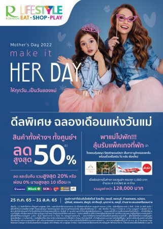 โรบินสันไลฟ์สไตล์ จัดเต็มช่วงเวลาแห่งความสุขกับแคมเปญสุดพิเศษ Mother’s Day 2022 MAKE IT HER DAY ให้ทุกวันเป็นวันของแม่ มาพร้อม ดีลพิเศษฉลองวันแม่ ลดทั้งห้างฯ และศูนย์ฯ สูงสุดถึง 50% พร้อมลุ้นบินพาแม่ไปเที่ยวงถึงเชียงใหม่ Khum Phaya Resort & Spa, Centara Boutique Collection ท็อปอัพแบบเน้นๆ กับโปรโมชั่นพิเศษ 4 ต่อ เริ่ม 25 ก.ค. 65 – 31 ส.ค. 65 ที่ โรบินสันไลฟ์สไตล์ ทุกสาขา