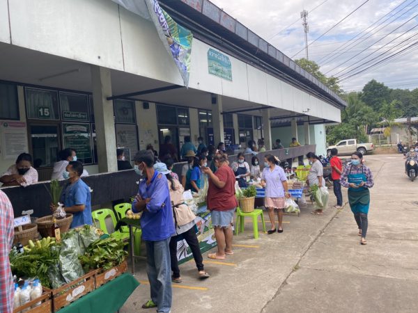 สนง.เกษตรบางสะพานน้อย​ นำอาหารพืชผักปลอดสารพิษบุกขายตลาดนัดสีเขียวโรงพยาบาลบางสะพานน้อย หลังโควิดเริ่มคลาย