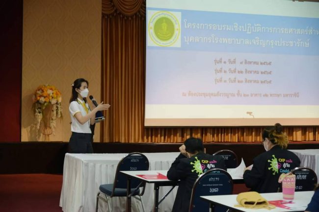 วันที่9สิงหาคม 2565 นพ.พรเทพ แซ่เฮ้ง ผู้อำนวยการโรงพยาบาลเจริญกรุงประชารักษ์ สำนักการแพทย์ กรุงเทพมหานคร เป็นประธานเปิดการอบรมเชิงปฏิบัติการ การยศาสตร์สำหรับบุคลากรของโรงพยาบาลฯจำนวน 3 รุ่น (รุ่นที่ 1 วันที่ 9 /รุ่นที่ 2 วันที่ 22 / รุ่นที่ 3 วันที่ 23 สิงหาคม 2565 ) เพื่อให้ความรู้ด้านการยศาสตร์ซึ่งเป็นเรื่องการศึกษาสภาพการทำงานที่มีความสัมพันธ์ระหว่างผู้ปฏิบัติและสิ่งแวดล้อมการทำงานเป็นการพิจารณาว่าสถานที่ทำงานดังกล่าวได้มีการออกแบบหรือปรับปรุงให้มีความเหมาะสมกับผู้ปฏิบัติงานอย่างไร เพื่อป้องกันปัญหาต่างๆที่อาจมีผลกระทบต่อความปลอดภัยและสุขภาพอนามัยในการทำงานและสามารถเพิ่มประสิทธิภาพการทำงานของบุคลากร โดยมีทีมแพทย์ นักกายภาพบำบัดและนักวิทยาศาสตร์การกีฬา กลุ่มงานเวชกรรมฟื้นฟู ให้ความรู้และช่วยแนะนำการฝึกปฏิบัติได้อย่างถูกต้องและเหมาะสม กิจกรรมนี้ส่งเสริมให้บุคลากรนำความรู้ที่ได้ไปฝึกปฏิบัติให้มีสุขภาพที่ดีและมีความสุขในการทำงานต่อไป
