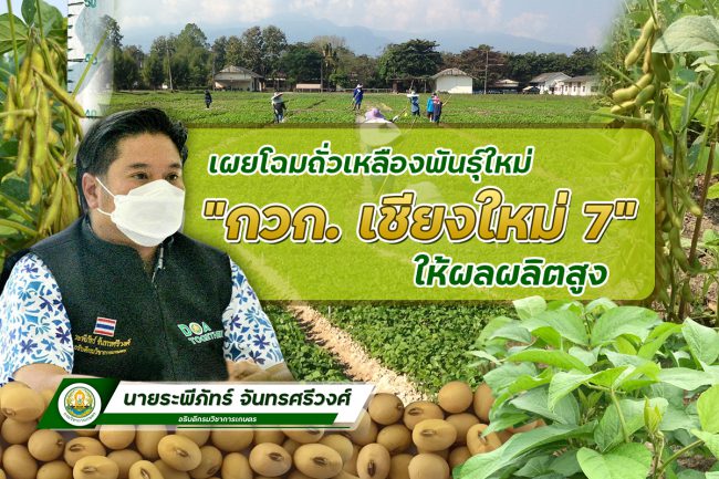 กรมวิชาการเกษตร  เร่งวิจัยปรับปรุงพันธุ์ถั่วเหลืองสานนโยบายรัฐบาลเพิ่มผลผลิตในประเทศให้สอดรับความต้องการบริโภค  พร้อมเพิ่มรายได้ให้เกษตรกร  จับถั่วเหลืองพันธุ์ฝักดกผสมพันธุ์ให้ผลผลิตสูง  ได้ถั่วเหลืองพันธุ์ใหม่ “กวก. เชียงใหม่ 7”  ลักษณะเด่นให้ผลผลิตสูง 304 กิโลกรัม/ไร่  แซงหน้าพันธุ์เดิมที่เกษตรกรนิยมปลูก  พร้อมให้ปริมาณโปรตีนสูงกว่า 35 เปอร์เซ็นต์
