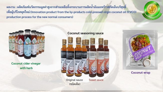 ผลงานดังกล่าว เป็นการพัฒนาผลิตภัณฑ์นวัตกรรมที่เกิดขึ้นจากการใช้ส่วนเหลือทิ้งจากกระบวนการผลิตน้ำมันมะพร้าวสกัดเย็นบริสุทธิ์มาเป็นวัตถุดิบและส่วนผสม โดยใช้เทคโนโลยีและกระบวนการทางวิทยาศาสตร์อาหารเพื่อพัฒนาเป็นต้นแบบผลิตภัณฑ์ที่มีศักยภาพทางการค้า และตอบโจทย์ผู้บริโภคยุคใหม่ โดยเน้นเป็นผลิตภัณฑ์อาหารที่มีคุณประโยชน์และมีคุณสมบัติเชิงสุขภาพ อีกทั้งเป็นการลดส่วนเหลือทิ้งในกระบวนการผลิตให้เป็นศูนย์ (Zero waste)
