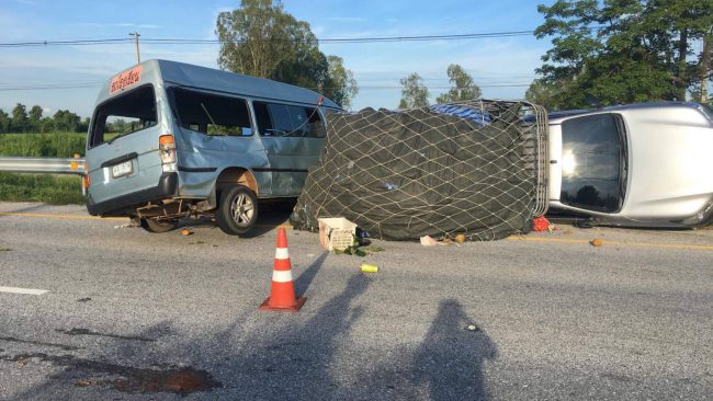 เกิดอุบัติเหตุรถตู้รับส่งนักเรียนประสานงารถกระบะขนส่งพืชผลการเกษตรทำให้มีผู้ได้รับบาดเจ็บ