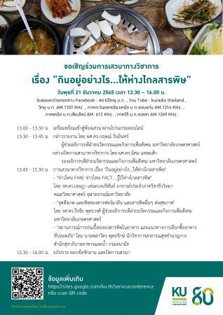 มหาวิทยาลัยเกษตรศาสตร์ โดยสำนักงานนวัตกรรมและพันธกิจเพื่อสังคม ร่วมกับ สำนักส่งเสริม และฝึกอบรม มก. และสถานีวิทยุ ม.ก. ขอเชิญเข้าร่วมรับฟังเสวนาทางวิชาการในหัวข้อ “กินอยู่อย่างไร…ให้ห่างไกลสารพิษ” ในวันพุธที่ 21 ธันวาคม 2565 ตั้งแต่เวลา 13.30 – 16.00 น. สามารถรับชมถ่ายทอดสดผ่านระบบออนไลน์ (Facebook และ Youtube) และรับฟังผ่านสถานีวิทยุกระจายเสียง มก.