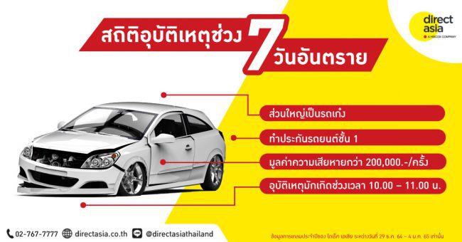 จากการรวบรวมสถิติการเคลมประกันภัยในช่วงเทศกาลปีใหม่ โดยเฉพาะช่วง 7 วันอันตรายในปีที่ผ่านมา ของ ไดเร็ค เอเชีย พบว่า รถที่เกิดอุบัติเหตุส่วนใหญ่เป็นรถเก๋ง และมีการทำประกันภัยรถยนต์ชั้น 1 โดยมีมูลค่าความเสียหายมากกว่า 200,000 บาท และมักเกิดอุบัติเหตุในช่วงเวลา 10.00 – 11.00 น. จากสถิติดังกล่าว ชี้ให้เห็นว่าผู้ใช้รถใช้ถนนในช่วงปีใหม่ควรขับขี่อย่างมีสติ ระมัดระวัง ปฏิบัติตามกฎจราจรอย่างเคร่งครัด และงดการบริโภคเครื่องดื่มแอลกอฮอล์ในขณะขับขี่ เพื่อช่วยกันลดความสูญเสียในช่วงเทศกาลแห่งความสุข