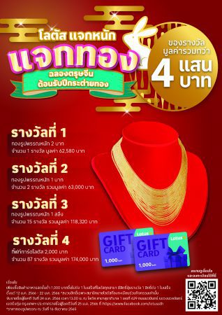 - ซื้อครบได้ลุ้นอีก โลตัส แจกทองฉลองตรุษจีน และรางวัลรวมมูลค่ากว่า 400,000 บาท เพียงซื้อสินค้าในแผนกอาหารสดขั้นต่ำ 1,000 บาทต่อใบเสร็จ ภายในวันที่ 12 – 25 มกราคม 2566 เฉพาะลูกค้ามายโลตัสเท่านั้น
