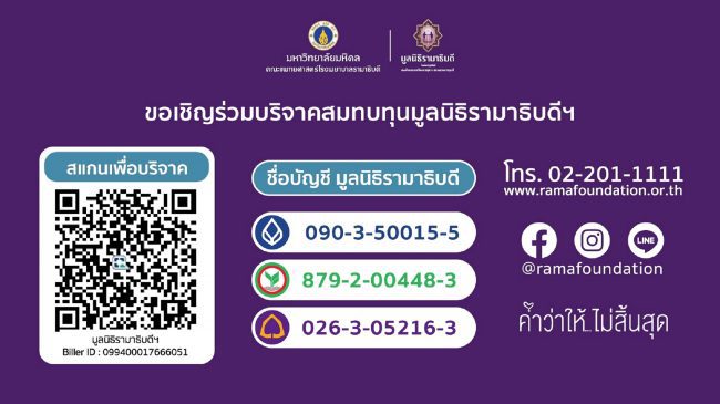- เพราะคนไทยมีน้ำใจและถูกปลูกฝังให้ช่วยเหลือกัน ทุกครั้งที่เกิดความต้องการเร่งด่วน อย่างเหตุการณ์โรคอุบัติใหม่ อุบัติภัยทางธรรมชาติ การก่อสร้างอาคารโรงพยาบาลแห่งใหม่ คนไทยก็จะร่วมช่วยเหลือตามกำลังที่มี นอกเหนือจากการบริจาคเงิน อาจจะเป็นการให้แรงกาย แรงใจ ความสามารถเป็นจิตอาสา บางคนก็ช่วยเหลือโดยการบอกต่อ กดไลค์ กดแชร์ สำหรับมูลนิธิรามาธิบดีฯ เราเชื่อว่าการให้จากทุกน้ำใจนั้นมีคุณค่า และสามารถช่วยเหลือผู้อื่นได้อีกมาก