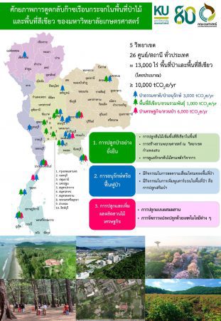 - มิติป่าไม้และพื้นที่สีเขียว โดยการประเมินความสามารถในการเป็นแหล่งกักเก็บคาร์บอนไดออกไซด์จากพื้นที่ป้าไม้และสีเขียวของ 5 วิทยาเขต และ 26 สถานีวิจัย รวมประมาณ 13,000 ไร่ และเพิ่มพื้นที่อันเป็น การเพิ่มศักยภาพในการดูดซับคาร์บอนไดออกไซด์