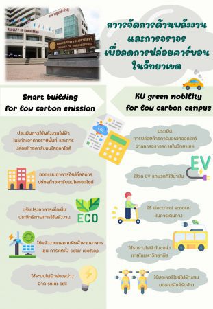 - มิติพลังงาน โดยการปรับปรุงประสิทธิภาพการใช้พลังงานของอาคาร การใช้พลังงานหมุนเวียน (Solar roof, Wind farm) การใช้รถโดยสารสวัสดิการภายในมหาวิทยาลัยเกษตรศาสตร์แบบไฟฟ้า เพื่อลดปริมาณการปล่อยก๊าซเรือนกระจกจากแหล่งปล่อยหลัก