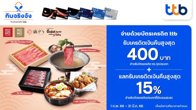 กินจริงจัง กับบัตรเครดิต ttb รับเครดิตเงินคืนสูงสุด 400 บาท พร้อมแลกรับเครดิตเงินคืนสูงสุด 15%