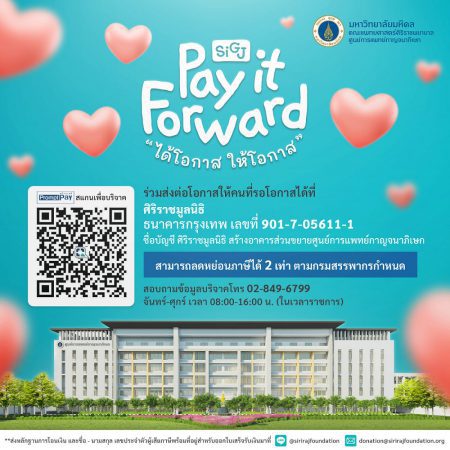 ศูนย์การแพทย์กาญจนาภิเษก คณะแพทยศาสตร์ศิริราชพยาบาล มหาวิทยาลัยมหิดล เชิญชวนร่วมเป็นหนึ่งในโครงการ ได้โอกาส ให้โอกาส ระดมทุนเพื่อปรับปรุงห้องผ่าตัดให้ทันสมัยและก่อสร้างอาคารหอผู้ป่วยในหลังที่ 2 พร้อมขยายขนาดบริการเป็น 400 เตียง ดูแลผู้ป่วยแบบครบวงจรทุกมิติ ชูมาตรฐานการรักษาเดียวกับศิริราช