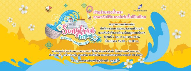 ศูนย์การค้า แพลทินัม เชิญชวนทุกท่านร่วมสรงน้ำพระ ขอพรเสริมสิริมงคลในเทศกาลสงกรานต์วันขึ้นปีใหม่ไทย ในงาน “Songkran Festival” วันนี้ – 16 เม.ย. 66 พร้อมช้อปคลายร้อนกับสินค้าอาหาร แฟชั่น ต้อนรับซัมเมอร์ อาทิ เสื้อลายดอกสีสันสดใสใส่สบายคลายร้อน, ปืนฉีดน้ำ, กระเป๋ากันน้ำใส่เล่นสงกรานต์ นอกจากนี้ยังมีของฝากของที่ระลึกสุดประทับใจ เช่นกระเป๋าใส่พาสปอร์ต DIY, กระเป๋าสตางค์, กระเป๋าเอนกประสงค์ลายดอกไม้ ฯลฯ และชวนช้อปชิมอิ่มอร่อยกับเมนูอาหารสตรีทฟู้ดมากมาย เช่น ปอเปี้ยะทอด, เกี๊ยวซ่า, โรตีชาชัก และเครื่องดื่มเย็นๆชุมฉ่ำดับกระหายคลายร้อน สุดสนุกเพลิดเพลินไปกับการแสดง วงดนตรีสามช่า สาวรำวงย้อนยุคแบบไทยๆ ในวันที่ 7 และ 8 เมษายน 2566 ตั้งแต่เวลา 15.00 – 18.00 น.