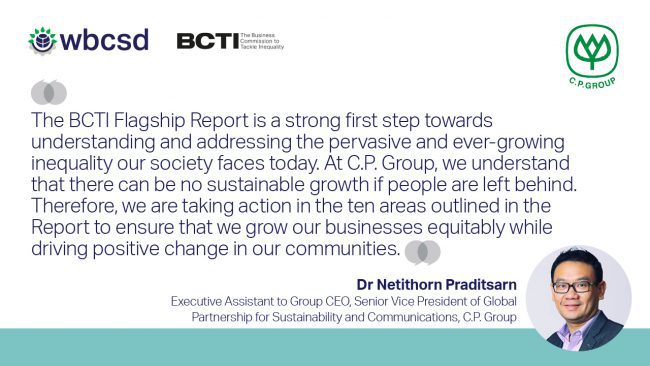สภาธุรกิจโลกเพื่อการพัฒนาอย่างยั่งยืน (World Business Council on Sustainable Development – WBCSD) เผยแพร่รายงาน Tackling inequality: An agenda for business action ซึ่งเป็นรายงาน ของโครงการ The Business Commission to Tackle Inequality (BCTI) เพื่อจัดการปัญหาความไม่เท่าเทียม ลดความเหลื่อมล้ำและกระตุ้นให้ภาคเอกชนมีส่วนร่วม ทั้งนี้ บริษัท เครือเจริญโภคภัณฑ์ จำกัด เป็นภาคธุรกิจไทยเพียงบริษัทเดียวที่ได้รับเชิญให้ร่วมเป็นสมาชิกคณะกรรมาธิการระดับโลกนี้