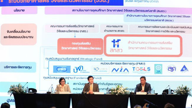 นอกจากการจัดทำแผนฯ สกสว.ยังมีหน้าที่ในการบริหารและจัดสรรงบประมาณด้าน ววน. รวมถึงการพัฒนากองทุนววน. ซึ่งปัจจุบันมีความร่วมมือ และ ดำเนินการแล้วทั้งหมด 3 แห่ง คือ 1.มูลนิธิกสิกรไทย 2.กองทุนพัฒนาไฟฟ้า และ 3.มูลนิธิกองทุนนวัตกรรมเพื่ออุตสาหกรรม สภาอุตสาหกรรมแห่งประเทศไทย ที่เพิ่งลงนามร่วมกันเมื่อเดือนเมษายนที่ผ่านมา ซึ่งถือเป็นภาคเอกชนรายแรกของประเทศไทยที่ได้รับเงินทุนสนับสนุนจำนวน 1 พันล้านบาทจากกองทุนส่งเสริมวิทยาศาสตร์ วิจัยและนวัตกรรม ของ สกสว. ในการดำเนินโครงการ ‘กองทุนอินโนเวชั่นวัน’ ภายในกรอบระยะเวลา 3 ปี เพื่อสนับสนุนสตาร์ทอัพรุ่นใหม่ที่มีทักษะ ความรู้ ความสามารถ และมีฝีมือด้านเทคโนโลยีให้เติบโตได้ภายในประเทศ และสามารถก้าวไปแข่งขันกับประเทศอื่น ๆ