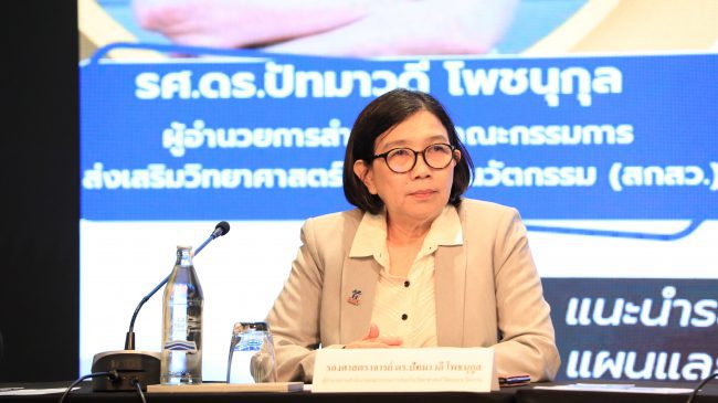 ด้าน รองศาสตราจารย์ ดร.ปัทมาวดี กล่าวว่า สกสว.มีภารกิจในการจัดทำแผนด้าน ววน. เพื่อเป็นเครื่องมือกำหนดเป้าหมายการพัฒนาวิทยาศาสตร์ วิจัยและนวัตกรรมให้สอดคล้องกับเป้าหมายของการพัฒนา ประกอบด้วย 4 ยุทธศาสตร์ ได้แก่ ยุทธศาสตร์ที่ 1 การพัฒนาเศรษฐกิจไทยด้วยเศรษฐกิจสร้างคุณค่าและเศรษฐกิจสร้างสรรค์ ให้มีความสามารถในการแข่งขัน และพึ่งพาตนเองได้อย่างยั่งยืน พร้อมสู่อนาคต โดยใช้วิทยาศาสตร์ การวิจัยและนวัตกรรม ยุทธศาสตร์ที่ 2 การยกระดับสังคมและสิ่งแวดล้อม ให้มีการพัฒนาอย่างยั่งยืน สามารถแก้ไขปัญหาท้าทายและปรับตัวได้ทันต่อพลวัตการเปลี่ยนแปลงของโลก โดยใช้วิทยาศาสตร์ การวิจัยและนวัตกรรม