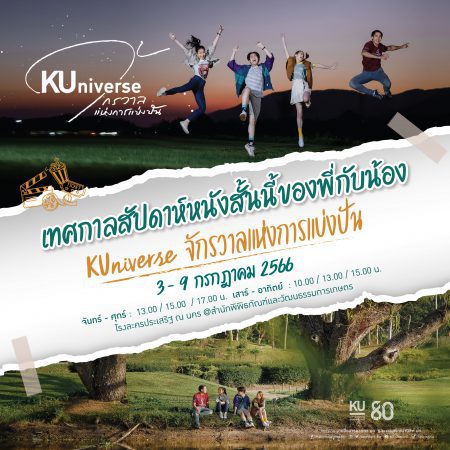 เนื่องโอกาสพิเศษดังกล่าวนี้ มหาวิทยาลัยเกษตรศาสตร์ ขอเปิดพื้นที่ให้ทุกท่านที่สนใจเข้าชมภาพยนตร์สั้น เรื่อง KUniverse : จักรวาลแห่งการแบ่งปัน โดยลงทะเบียนหน้างาน และสามารถติดตามข่าวสารความเคลื่อนไหวได้ที่ www.ku.ac.th และ https://web.facebook.com/PublicRelations.KU/