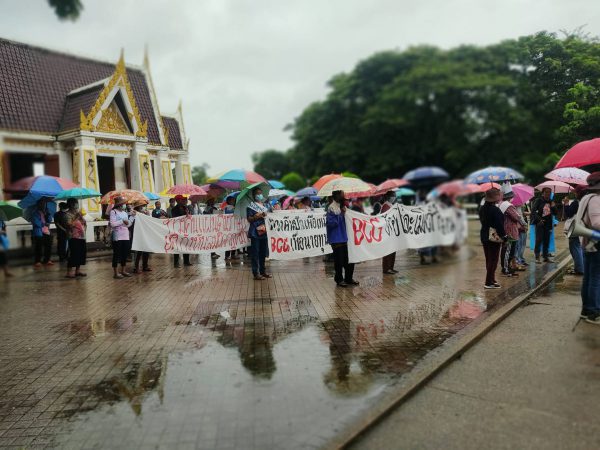 ชาวบ้านกว่า 100 คน ถือป้ายมาที่หน้าศาลากลางให้ยกเลิกกังหันลม