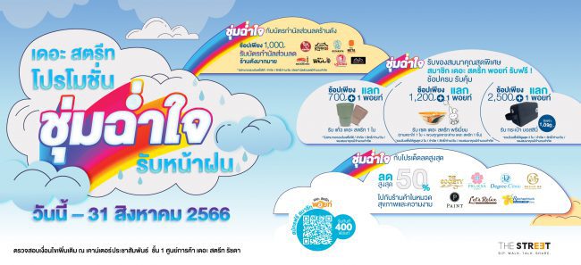 – เมื่อช้อป 1,200 บาท + แลก 1 พอยท์ (รวมใบเสร็จได้สูงสุด 2 ใบ) รับฟรีเซต เดอะ สตรีท พรีเมียม (ชามตราไก่ 1 ใบ + พวงกุญแจกระต่ายเดอะ สตรีท 1 ชิ้น)