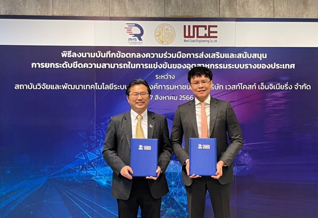 นายกิตติศักดิ์ มาพะเนาว์ กรรมการผู้จัดการบริษัท เวสท์โคสท์ เอ็นจิเนียริ่ง จำกัด หรือ WCE (ขวา) และ ดร.สันติ เจริญพรพัฒนา ผู้อำนวยการ สถาบันวิจัยและพัฒนาเทคโนโลยีระบบราง (องค์การมหาชน) หรือ สทร. (ซ้าย) ลงนามบันทึกข้อตกลงความร่วมมือการส่งเสริมและสนับสนุนการยกระดับขีดความสามารถในการแข่งขันของอุตสาหกรรมระบบรางของประเทศ บันทึกข้อตกลงระหว่าง WCE กับสทร. ดังกล่าวประกอบด้วยความร่วมมือใน 4 ด้าน ได้แก่ 1) ด้านการวิจัยพัฒนาเทคโนโลยีและนวัตกรรมระบบราง 2) ด้านการพัฒนาระบบการจัดทํามาตรฐานและการทดสอบ 3) ด้านการผลิตชิ้นส่วน และ 4) ด้านพัฒนาบุคลากรระบบราง เพื่อยกระดับขีดความสามารถทางเทคโนโลยีและสร้างอุตสาหกรรมระบบรางของประเทศให้มีความก้าวหน้า ณ สถาบันวิจัยและพัฒนาเทคโนโลยีระบบราง (องค์การมหาชน) เมื่อเร็วๆนี้