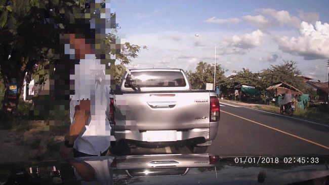 จากนั้นรถของคนร้ายได้ขับมาปาดหน้าจอดรถด้านหน้าของตน ซึ่งตนได้ลงไปดูความเสียหายของรถตนเองที่ถูกชน ต่อมาคนร้ายได้ลงมาจากรถแล้วมายืนชี้หน้า ด่าว่าตนด้วยถ้อยคำที่หยาบคายมาก ตนจึงได้ต่อว่าตอบโต้ไป และดูรถของคนร้ายแล้วพบว่า มีร่องรอยถูกเฉี่ยวชนมาก่อนแล้ว จึงเชื่อว่า เป็นแก๊งค์มิจฉาชีพชนแล้วตบทรัพย์ จากนั้น คนร้ายเหลือบเห็นกล้องหน้ารถของตน คนร้ายจึงได้ขึ้นรถแล้วขับกลับรถหลบหนีไปทันที ซึ่งเรื่องที่เกิดขึ้นนี้ ตนได้แจ้งให้ นายทองชุ่น สุรวิทย์ กำนันตำบลอีปาด อ.กันทรารมย์ จ.ศรีสะเกษ ทราบ ซึ่งกำนัน ต.อีปาด ได้แจ้งให้ ตร. สภ.กันทรารมย์ และแจ้งให้ นายอำเภออำเภอกันทรารมย์ ได้รับทราบเพื่อแจ้งเตือนให้ประชาชนที่ใช้เส้นทางระหว่างอำเภอกันทรารมย์ – ยางชุมน้อย ให้ใช้ความระมัดระวังเรื่องนี้ต่อไป